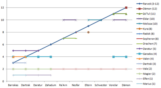 Rarvek nutzt 21 verschiedene Zauber der Magie des Lichts, der Dunkelheit, der Elfen und der Eldar.
