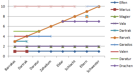 Rarveks Macht steigt weiterhin merklich an. Eine Tabelle der Machtlevel der jeweiligen Protagonisten / Rassen könnt ihr hier betrachten. Die horizontale Leiste spiegelt den aktuellen Stand in der Geschichte wieder: